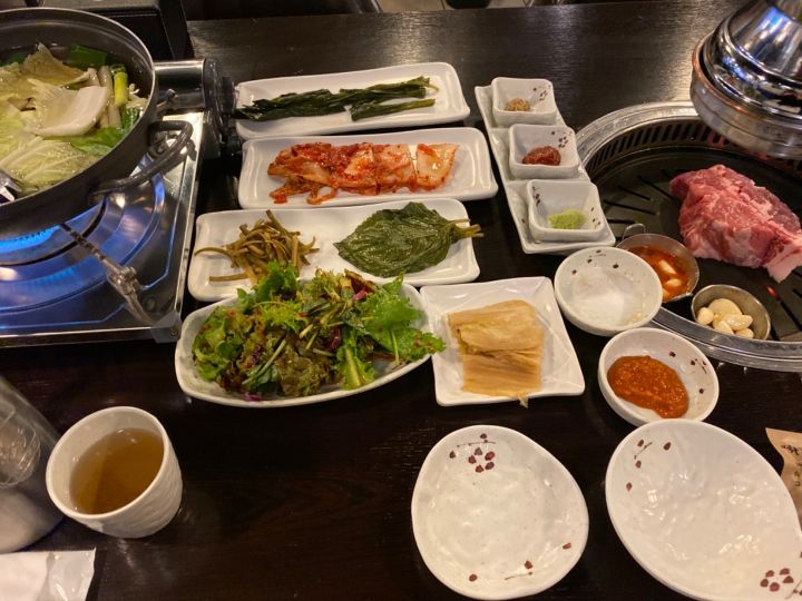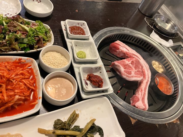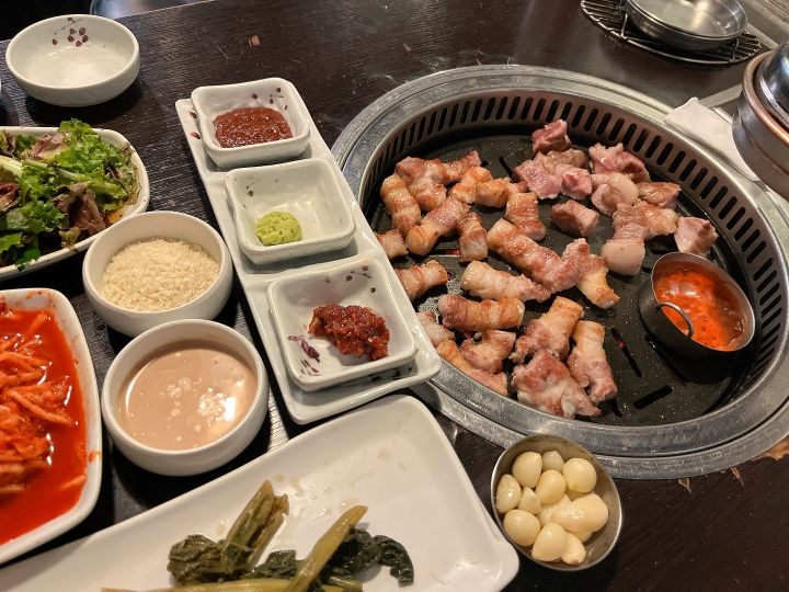 前回と同じメニューで、サムギョプサル1人前、モクサル2人前、冷麺、ビビンミョンを頼みました。