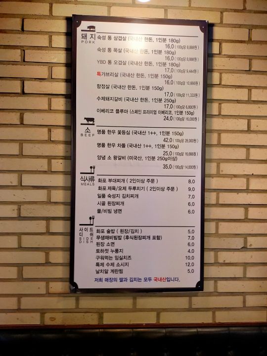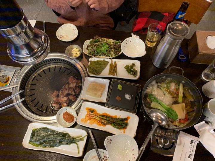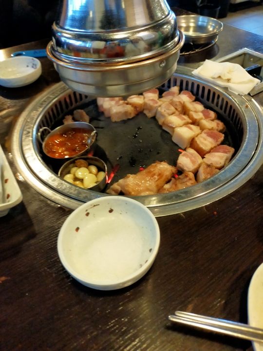 利用日:2019.11.08お気に入り追加サムギョプサルが食べたくて、1人でしたが平日の14時15分頃入店。席に着いてからお店のアジュンマに、「15時からブレイクタイムでサムギョプサルはやってない。スンドゥブなどの定食を頼んで」と言われましたㅠㅠしかし、どうしても諦めきれないでいるとアジュンマが厨房にいた男性従業員を呼んで来て日本語で「サムギョプサル?大丈夫ですよ。ただ15時からブレイクタイムです。」と提供してくれました!サムギョプサル2人前を注文。突き出しで出てくる海鮮スープがピリ辛なのですがこれが美味しい!お口直しにもなります。大好きなミョンイナムルとわさびでペロリと完食しました。ただ時間を気にしながら食べたので次回は余裕をもって行きたいです。