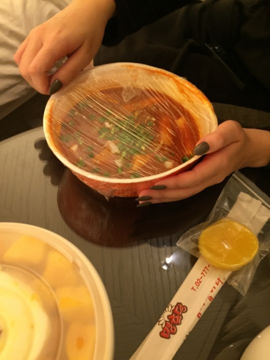 スープとたくわんとキムチがでてきます。そしてキムパッにびっくり!ご飯が茶色い。。。最初はちょっと戸惑いましたがひと口食べてびっくりしました!すんごく美味しいです!酢の味がめちゃくちゃ染み込んでいて、止まらなくなります笑 酢が大好物の私にはかなりどストライクなキムパッでした!