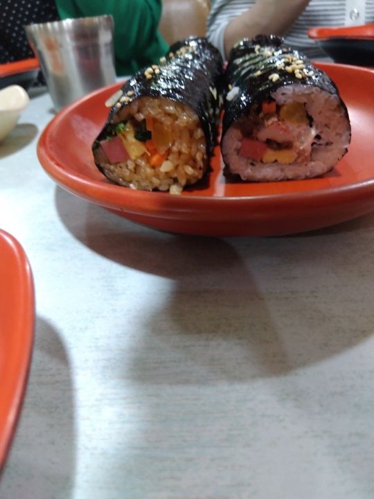 ツナキンパは売り切れとのことでオリジナルのキンパW45000をオーダー。すぐにスープとたくわん、続けてキンパが運ばれてきました。あまり沢山は食べられないので程よい量で、ペロリでした。口コミの通りごはんが酢飯で変わっていますが、とても食べやすく美味しかったです。スープも美味しかった。明洞のどまんなかで500円程度で軽く食事ができて、美味しくて。よいお店でした。他のメニューも気になります。次もし明洞でひとりごはんとなったら候補になるお店です。 -