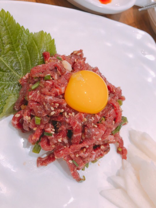 ユッケ 牛カルビ 味付けでない豚 スンドゥブ トッポギ を注文!ユッケはとても冷えていて卵と交ぜ付け合せの梨と食べると本当美味しくても1個欲しいくらいでした!