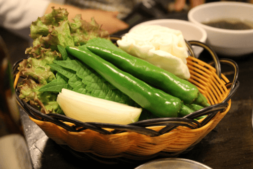 サンチュサムにご飯をのせて、その上に「熱炭プルコギ(열탄불고기)」2枚を乗せ、その上にねぎと生ニンニクを積んで口を大きく開けて一口で食べると頬が大きく膨らみ、口の中いっぱいになります。