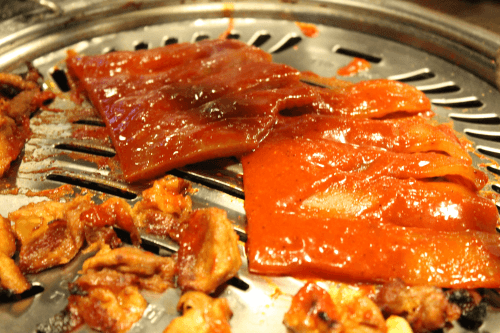 豚三枚肉(サムギョプサル)と、珍しい豚皮(コッテギ)を注文。サムギョプサルはもちろん美味しいのですが、コッテギの美味しさにヤられました!!!!