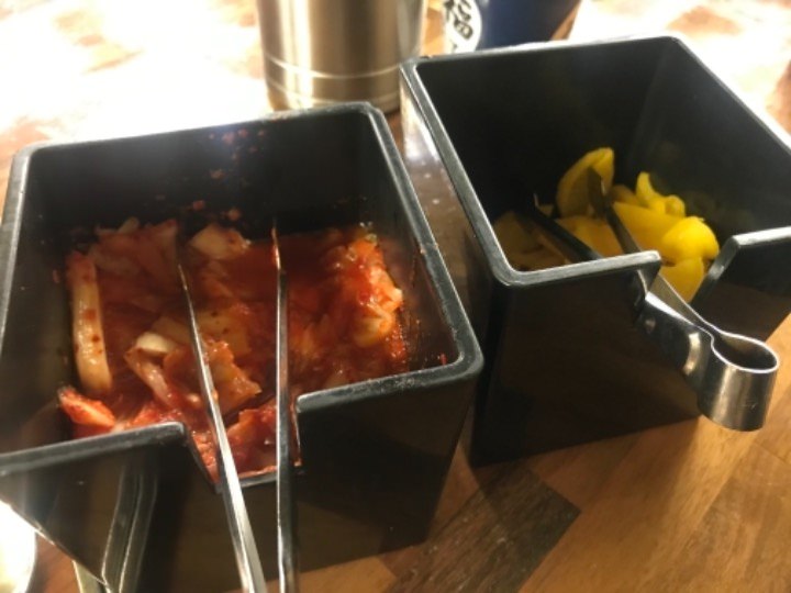 私たちは、チーズとんかつ、とんかつキムチ鍋、フライドポテトとビールを頼みました。まずビールが来ましたがキンキンに冷えていておいしかったです!フライドポテトはホクホクで甘めのチーズの粉がかかっていてとてもおいしかったです!ただ結構多めに出てくるので、とんかつとセットになっているフライドポテトを頼んでいいかもしれません。