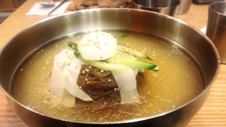 私たちは水冷麺とお肉のマンドゥを頼みました。冷麺が出てくるまではセルフコーナーでユッスを注いで飲みながら待ってました。ここのユッスがまた美味しくて大好きです!
