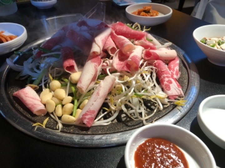 緑豆もやしやネギなどの野菜たっぷりに薄切り牛肉、チャドルパギを焼いて、すっぱいタレにつけて食べます。