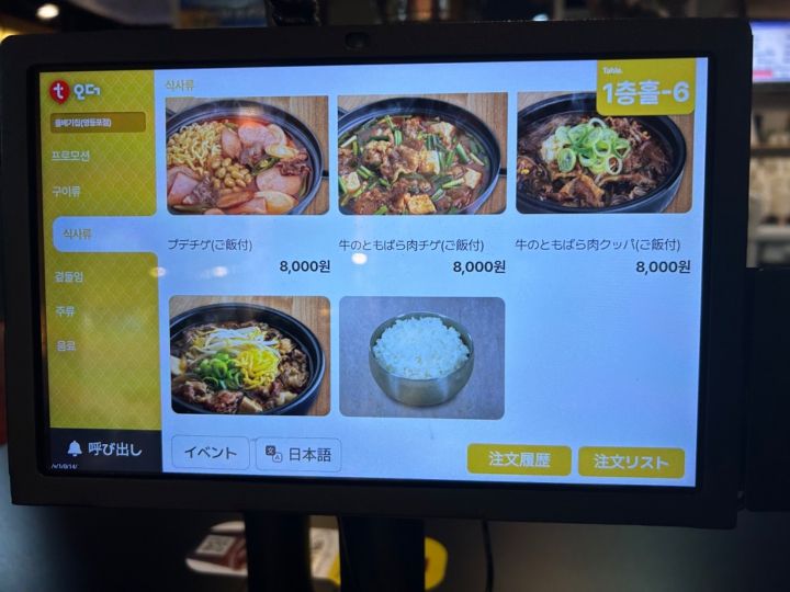 チャドルバギ9900ウォン(タッチパネルの日本語訳石刈り機はご愛嬌)、サムギョプサル9900ウォン、ビール5000ウォン、ご飯1000ウォン注文して女性ひとりでもペロッと食べられました。注文はメニュー写真つきタッチパネル(変な訳の日本語あり)です。お会計は25800ウォンでした。