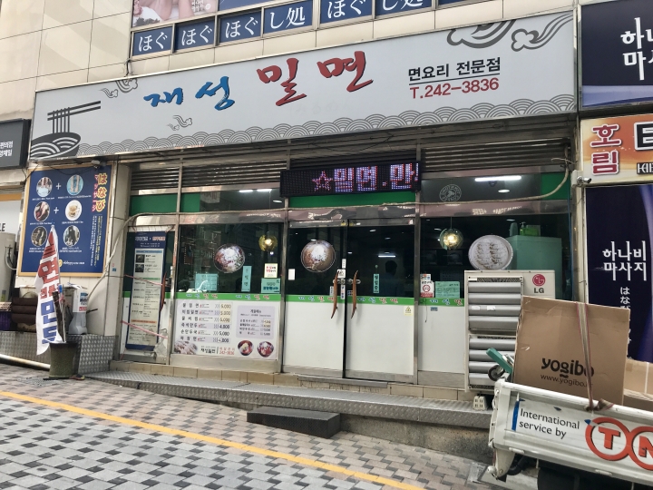 釜山名物のミルミョンが5,000ウォンでしたムルとビビムとムルビビムの3種類があるようで、どう違うのかイマイチ把握できてませんが(笑)、ムルは恐らく辛くないだろうと思ってムルを注文!ヤンニョムがすこしかかっていましたが、全然辛くなくて大丈夫でした~!はさみを少しだけいれたところ、麺はかなり固くて歯ごたえ抜群!!はさみをさらに入れて細かくしました。かみごたえがあってサッパリしていて、美味しくお腹いっぱいになりました!こちらのお店を「みんなのお店」に登録していただき、ありがとうございます。