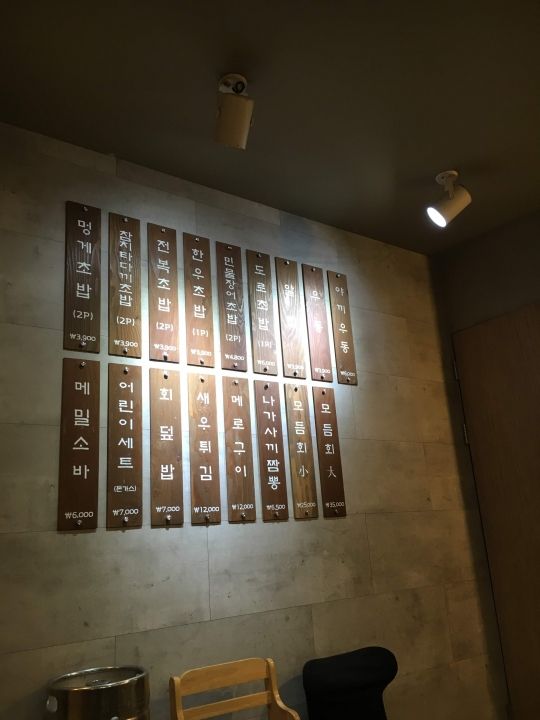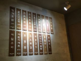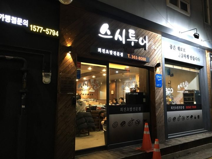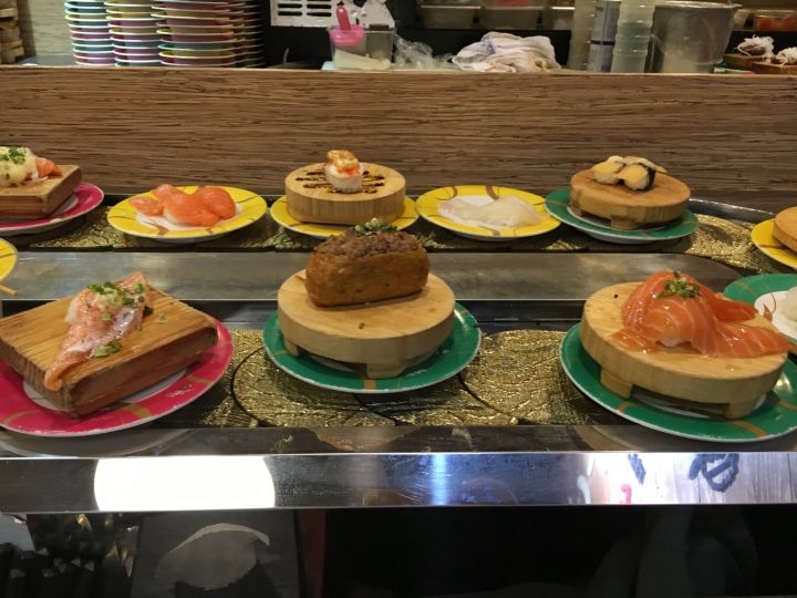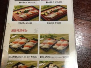 一皿1950ウォンの回転しているお寿司にはサーモン、白身、生エビなどがあり、結構食べれます。別でトロやウナギなどの少し高いのもあります。