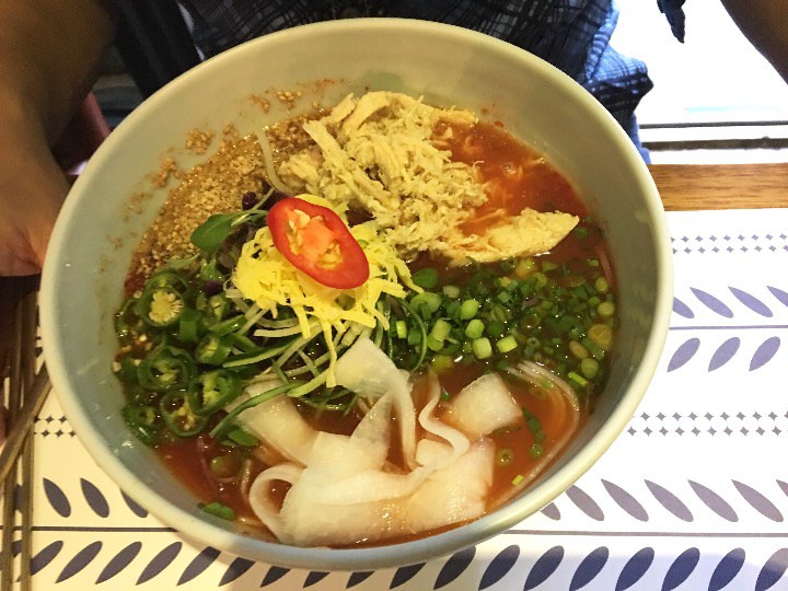 以前、「野菜がいっぱい入っているのはどれ?」と尋ね、勧められたメニューを注文したところ、麺料理とは別に、茹でた小エビとささみが小皿に入れられて出てきました。