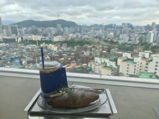 一階の注文カウンターから大きなガラス張りになっていて、奥の景色がよく見えます。コーヒー、デザートのほか、ワインやビールも扱ってます。カフェラテが7,500ウォン、クロワッサンが6,000ウォンと高めなのは、お約束の展望台料金という事で。
