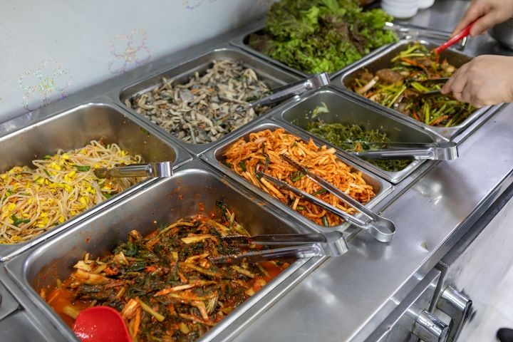 おかずは無制限提供となっていますが、私が行った日にはもやし(콩나물)、きのこ炒め(버섯볶음)、キムチ(김치)、大根キムチ(무김치)、わかめの茎炒め(미역줄기볶음)、どんぐりこんにゃくの和え物(도토리묵무침)、サンチュ(상추)があり、ご飯も無制限に食べられます。