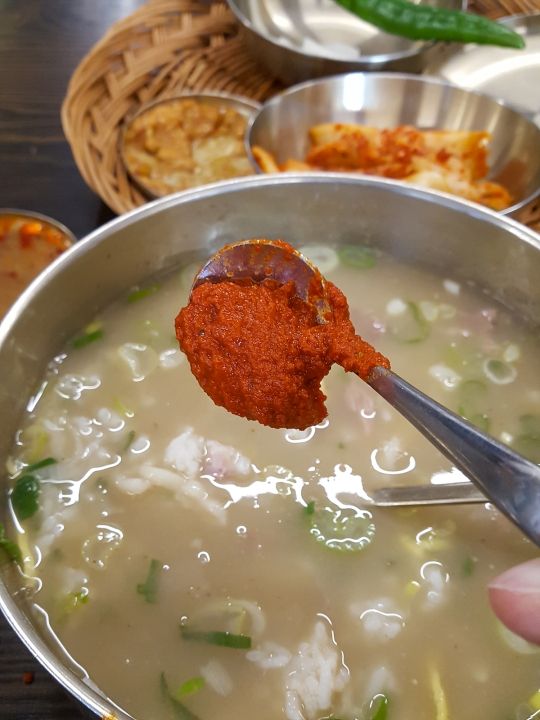 タッカンマリ食べる時みたいな、コチュとマヌルとお酢を混ぜたソースもあって、お肉をつけたり、スープに入れたら味変もできます!