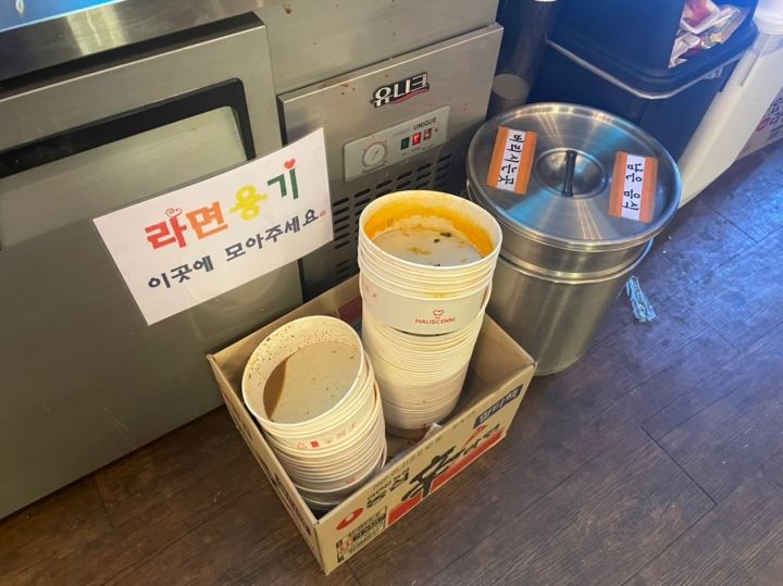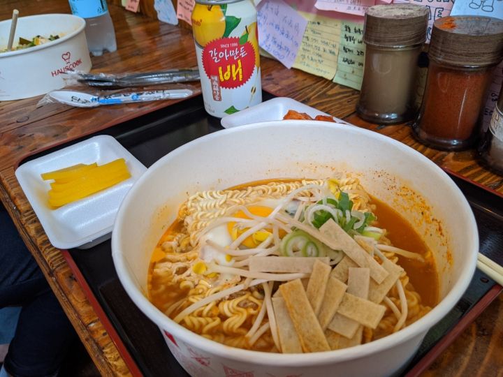 韓国土産にも人気のインスタントラーメンが、ずらりと並んでいて、セルフで作って食べられるお店…というか空間です。ハンガンのコンビニとかでラーメンを作った事がある方もいるかと思いますが、それの都心版ですね。ラーメン一袋3,000ウォン程度と値段は割高です。