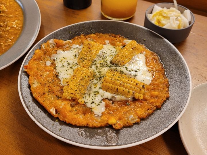 キムチのチヂミは、コーンとチーズたっぷりでお菓子みたいで、美味しいし、葉っぱのボールみたいなもの(サムパッ)もユニークな感じ。