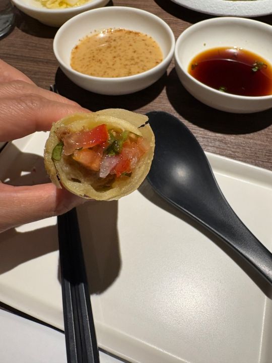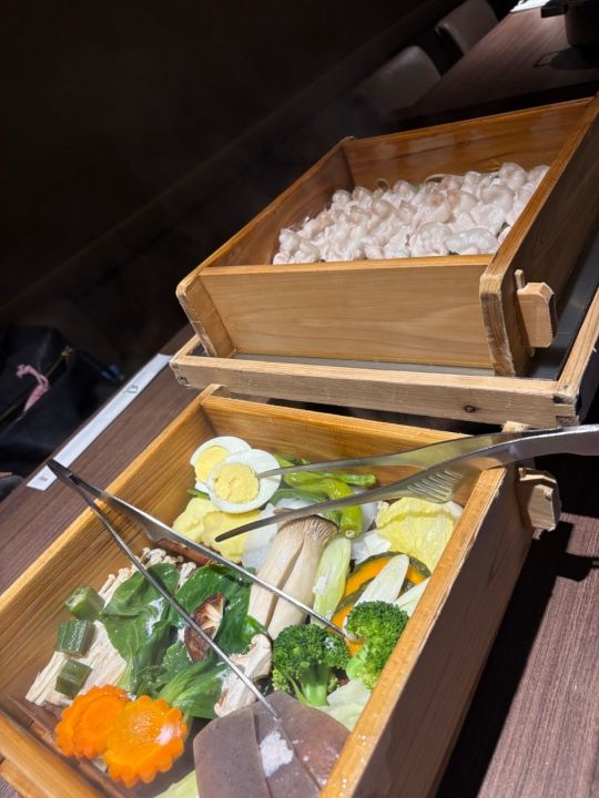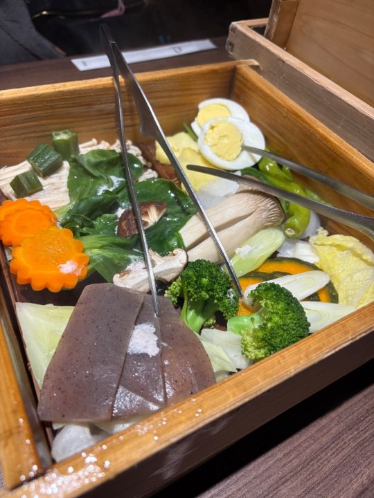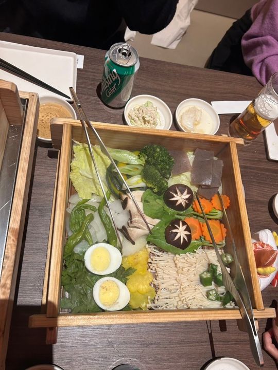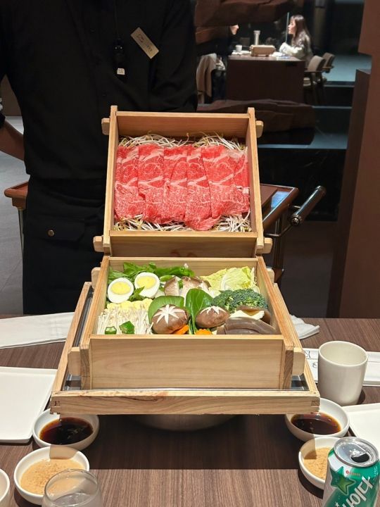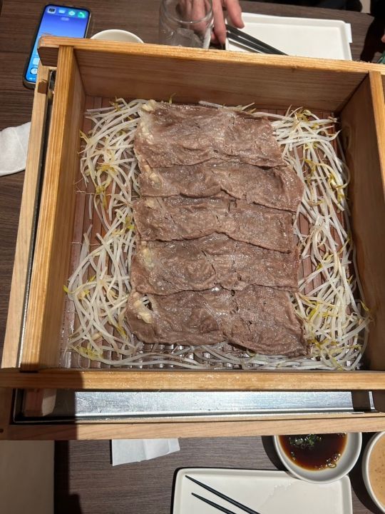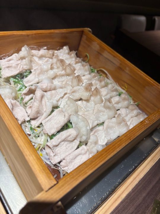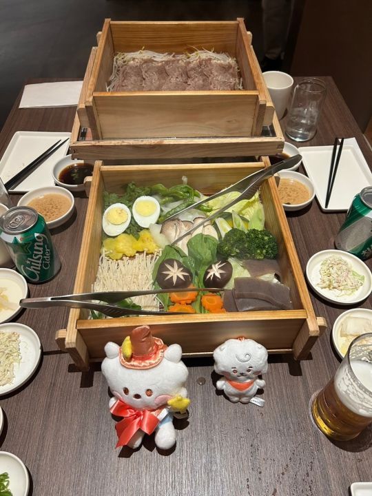 初めて行ったのでお店を探すのに迷いましたが無事テーブル席を用意して頂きました。店内はほぼ満席でしたがラストオーダーが8時半までなので食事だけする感じです。セイロ蒸し+野菜+ドリンクで1人25000ウォンです。他にサイドメニューもありますがこれで十分お腹いっぱいになりました。ゴマだれが美味しかったです。蒸し料理なのでヘルシーなのが嬉しいですね。受付の男性が強面なのとスタッフの男性も淡々と説明して写真を撮るARMYの方が多いのか撮りやすいようにセイロのお肉を見やすいように持ってくれてましたが終始無表情です。全体的にBARのような雰囲気で接客対応はお客様を選んでるようです。イチゲンさんには冷たいです。残念ですが2度目はないかな。以上 -