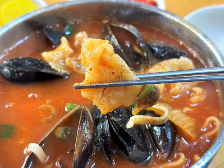 スープの見た目は真っ赤ですが、激辛ではなくピリ辛程度です。唐辛子よりも、キムチのスープの酸味の方が強く感じられるスープの中に、もちもちのカルグクスとスジェビが入っています。スジェビの方がかなり弾力があって、小麦粉感がより感じられます。ムール貝もたくさん入っていて、海鮮出汁がほのかに効いています。