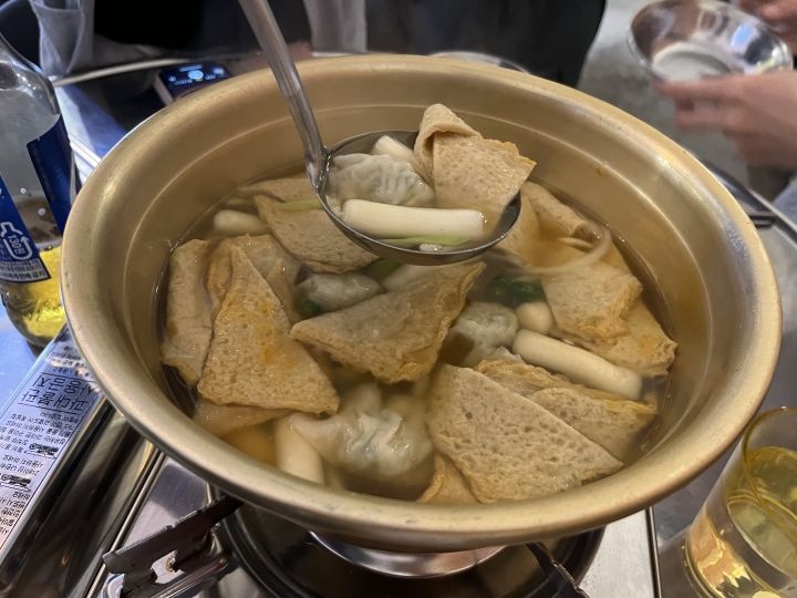 注文したのはオデンタン、フルーツサラダ、ビール2本。オデンタンにはオムク、トッポキ、ギョーザが入っていてやさしいお味です。またフルーツサラダは店主の女性が「バナナがないけど、リンゴを多めに入れとくね」と言ってたとおり、リンゴ多め、パイナップル、ピーナツ、干しブドウが入っていてこれまた酔っ払いには丁度いい感じでした。