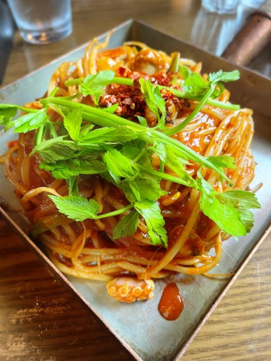 出汁ベースのもつ鍋(白)と辛いタコのお好み焼きを選びました。