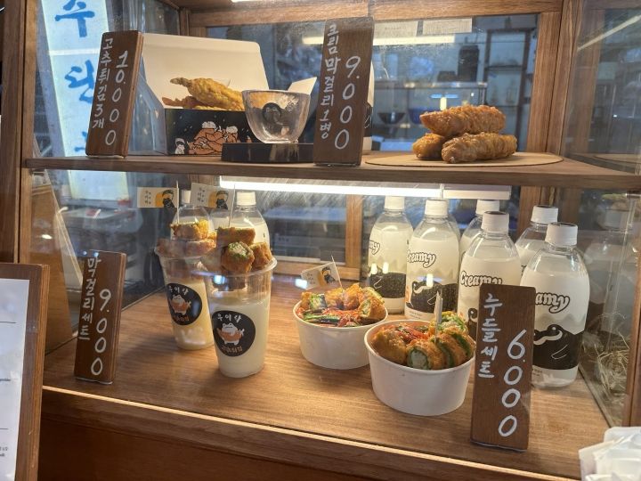 マッコリセットは9000ウォンで、カップの上が天ぷら1つをカットしたもの、