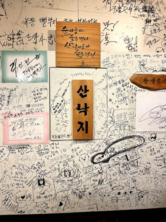 壁の来客者記念の筆?や芸能人のサインが目に入りました。人気あるお店の様です。