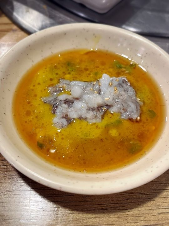 マヌル、青唐を入れた鶏卵にタコをくぐらせ海苔にON、微塵切りの沢庵も散りばめて頂きました。胡麻油の風味も加わりシンプルな素材が、まったりとした重厚な味に完成されました。