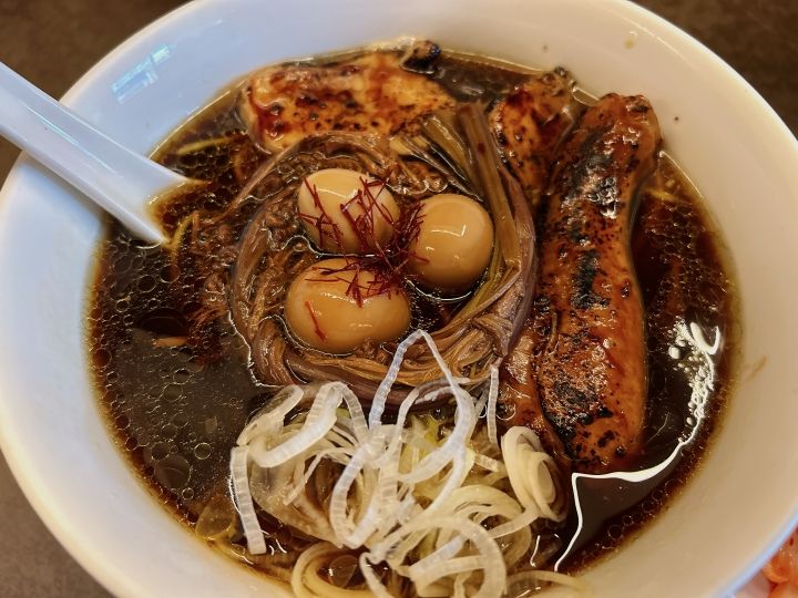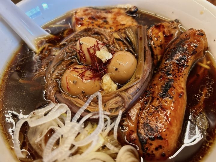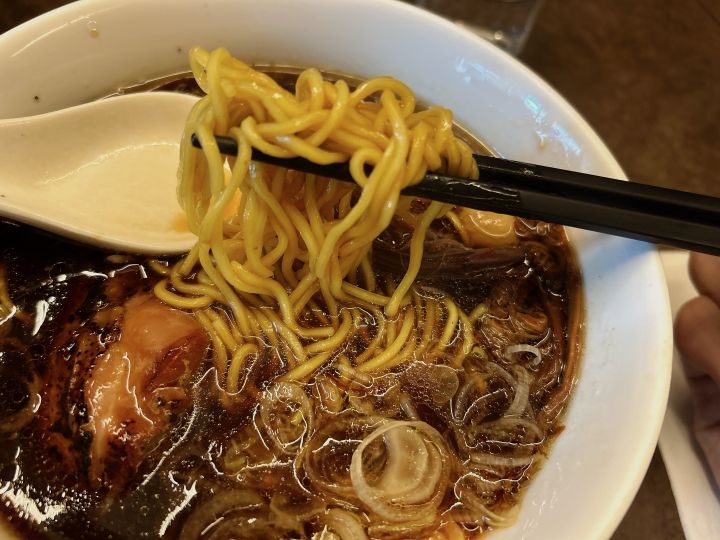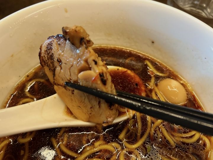 黒のイメージ通り醤油ベースの真っ黒いラーメンが出て来ました。