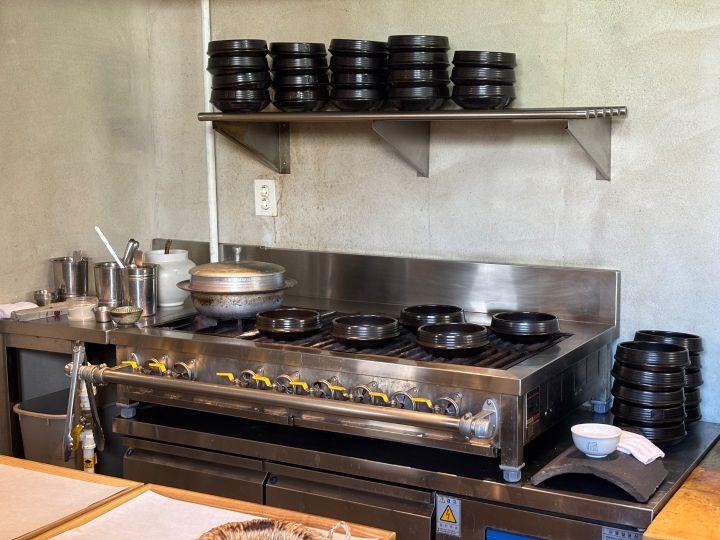 3つの黒い釜、炊飯用に2つ、奥にスープ用の大きいサイズがあり、隣にはコンロが並んでいました。