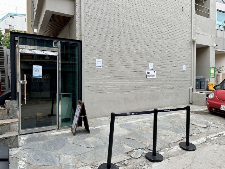 クルマが通る道路からお店の外観が撮影できるんですが、道路側の入口からはカフェに入れず、裏手に回って地下1階に降りるのが入店のルートなので、お気を付けください。