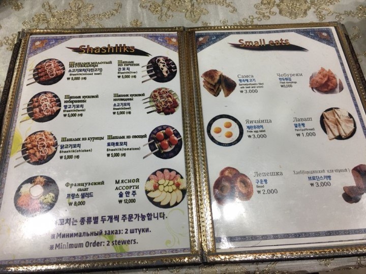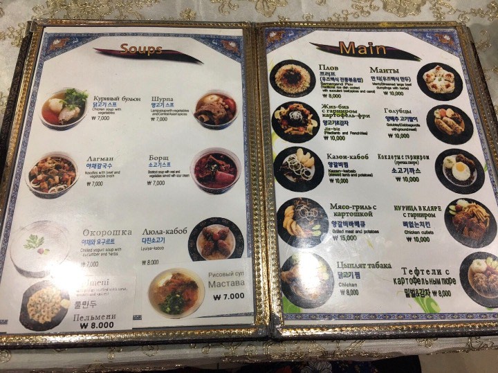 プロフというウズベキスタンのピラフの8000ウォンと、肉入りのサモサ4000ウォンを注文しましたが、どれも美味しい!ボリュームもあって、プロフだけでお腹一杯になったけど、美味しかったのでサモサも完食しました。客層は、ウズベキスタン人らしき風貌の人が三分の二で、残りは韓国人らしき風貌の三分の一といった感じでした。独りでも、追い出される感じはなく、良い対応でした。帰りに、片言のロシア語で店主に、お会計をお願いすると、店主はロシア語で「どう?美味しかった?また来てね!」と言い、店の名刺をくれました。忙しい時間帯に、独りでの訪問でしたが、良い対応と美味しい料理でした。日本では食べることの出来ないウズベキスタン料理なので、また、機会あれば訪問したいです。 -
