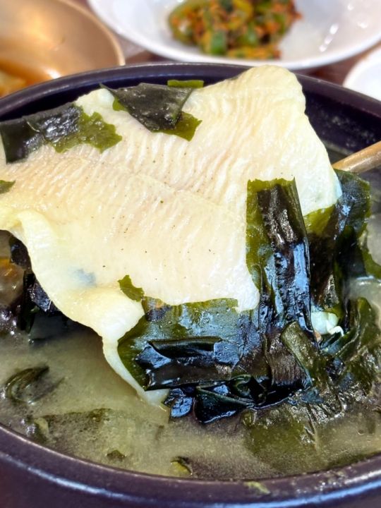 ワカメスープには、大きな鰈が入っています。ワカメもいっぱいですね。底には貝も潜んでいました。