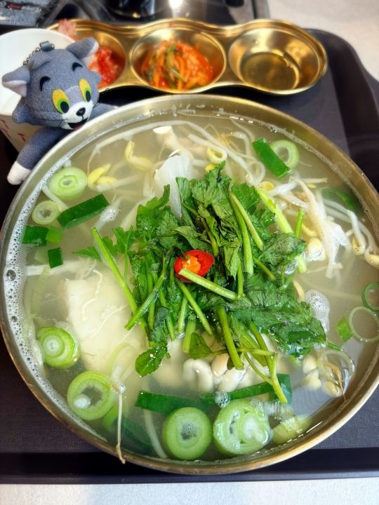 スープは、器いっぱい、並々と注がれています。ミナリ、鱈、豆もやし、ネギ、大ぶりの大根で構成されていました。スープは塩味のスッキリとした味わいです。