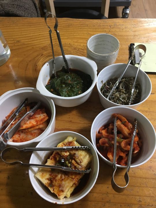 何より感動したのが、パンチャンの美味しさ!この日は白菜キムチ、ごぼうの和え物、ほうれん草の和え物(清麹醤で和えてあるっぽい)、豆腐焼き、ヤンニョムケジャンでした。どれを食べてもタレの味付けが絶妙で、本当に美味しかったです。特に豆腐焼きは豆腐自体の豆の味が濃くて、醤油ベースのタレとよく合います。ヤンニョムケジャンも少し甘いタレが絶妙で、手を真っ赤にしながら食べていました。ごぼうの和え物も少し酸っぱいタレと山ごぼうの風味が最高でした。
