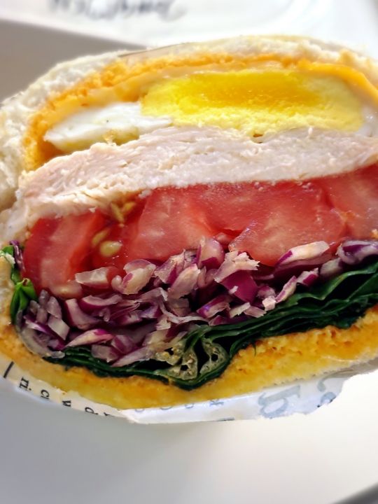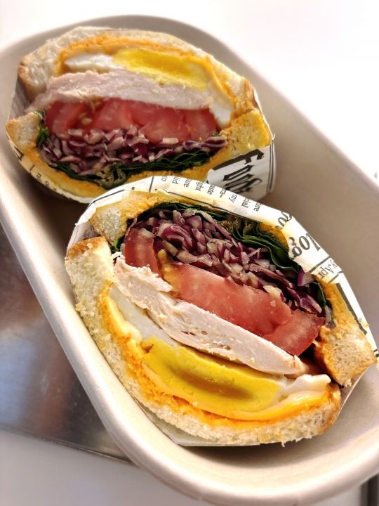 彩り豊かなサンドイッチは、ふくよかなチキンブレストと卵、トマト、レッドキャベツ達と共に美しい断面で誘います。
