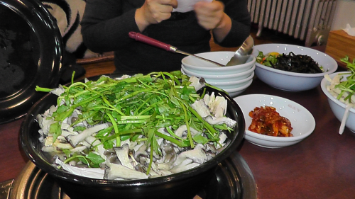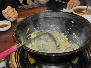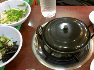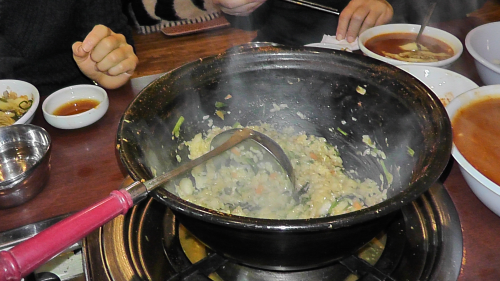 熱いスープが早く飲みきれず、ポックンパのご飯を反則技で雑炊にしようと投入しかけた矢先、アジュンマが大あわてで跳んできました(笑)