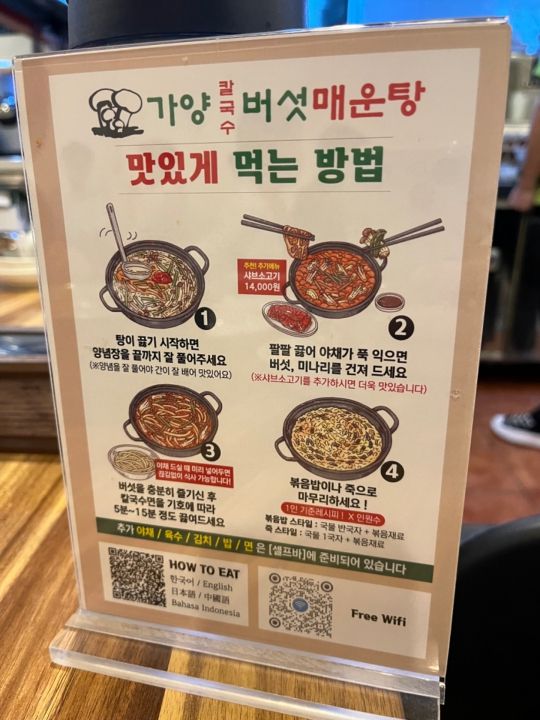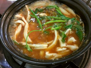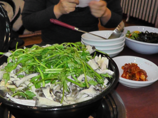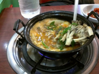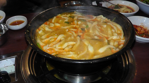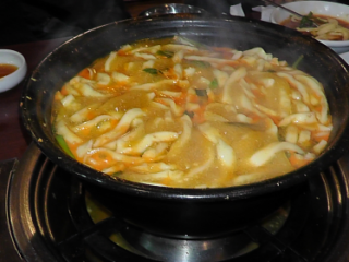 席に案内されて座ると、「一人分?」と聞かれて、ほどなくカルグクスポソッメウンタンの鍋がやってきます。