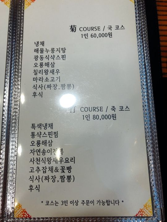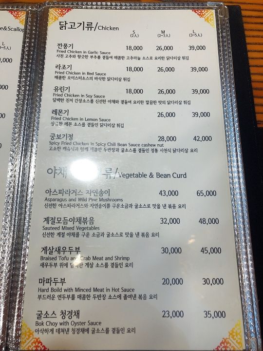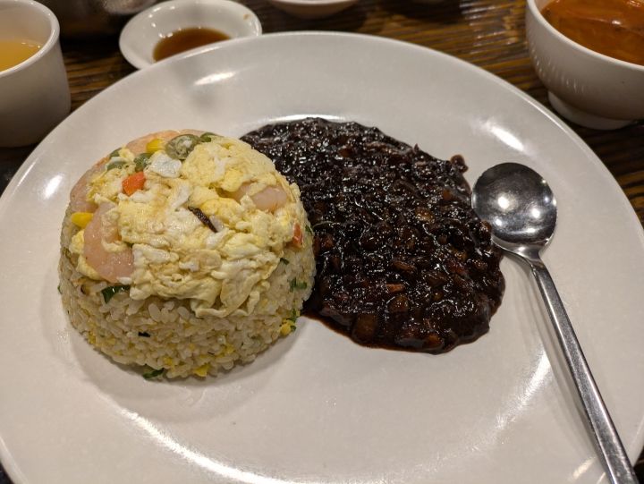 昔の記憶(10年以上前)ではこんな雰囲気じゃなかったのになあと少し残念な気分で、平たい唐辛子チャジャンミョン(7,000ウォン)と海鮮うどん(8,000ウォン)、酢豚の小(15,000ウォン)を注文。