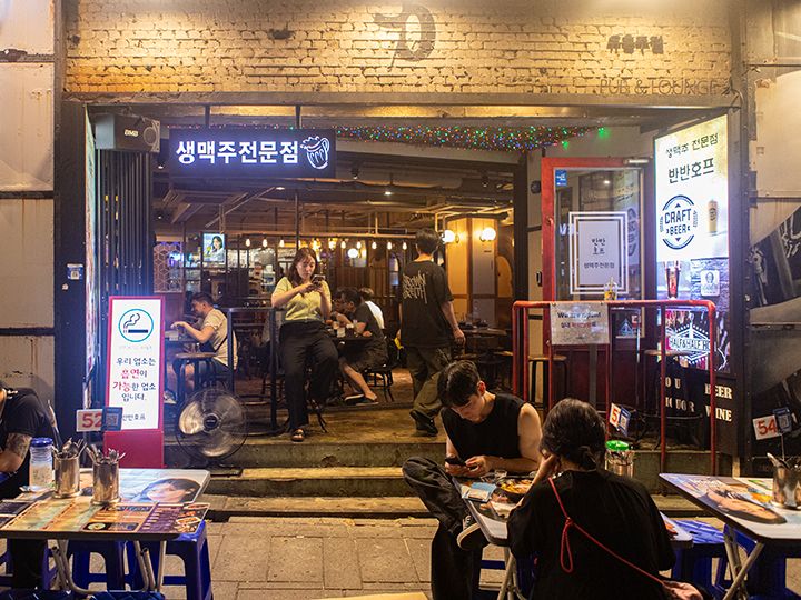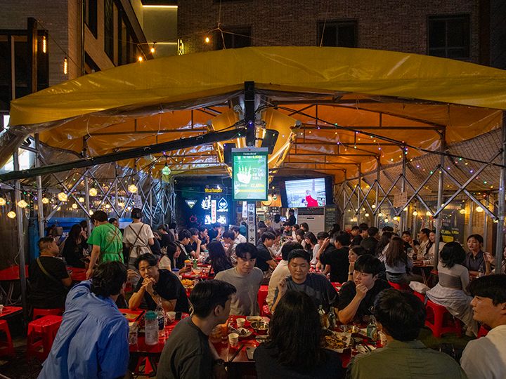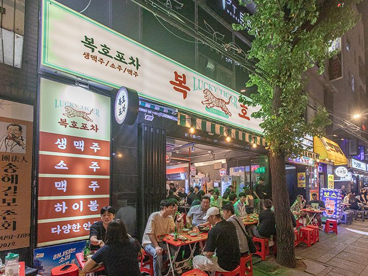 鐘路3街ポジャンマチャ(飲み屋屋台)通りは、かつて焼酎を飲む中高年で賑わっていましたが、近年、 店舗前に外飲み席を設ける店が増え、さながら路上ビアガーデンのよう。ますます賑やかになりました。こうした外飲みができる店や場所を指すヤジャン(야장)という言葉も生まれました。