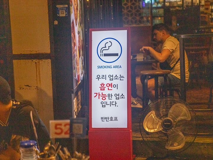 外飲み席というより内部が広くビアホールの雰囲気。注目は店内で喫煙可能なこと(遊興業登録をしているため)。飲食店での喫煙不可の韓国でスモーカーには貴重な存在。