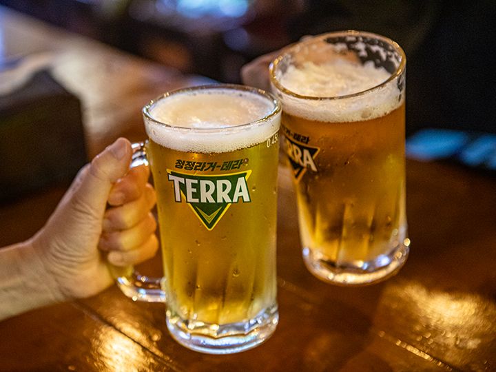 昔ながらのスタイルで飲むなら、やはり焼酎。ポジャンマチャの場合、ビールは瓶ビールになります。韓国に来た!そんな気分を実感できる空間のポジャンマチャです。