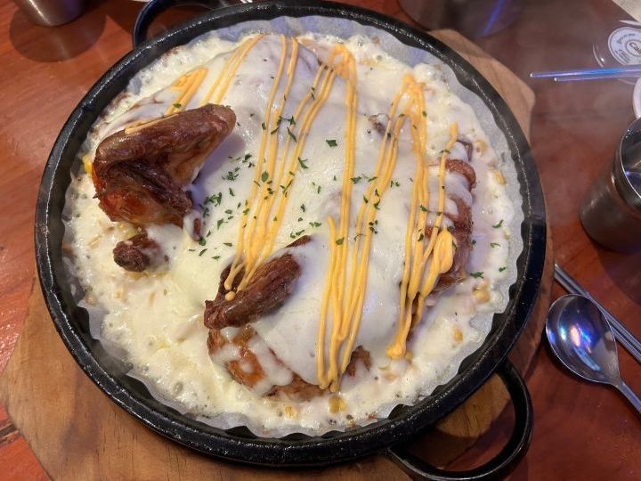 もち米を詰め込んだ鶏肉をまるごと一羽焼き上げた料理。人気メニューはチーズとコーンがたっぷりトッピングされた「チーズコーン入り鶏丸焼き」。カリカリのおこげがたまりません。