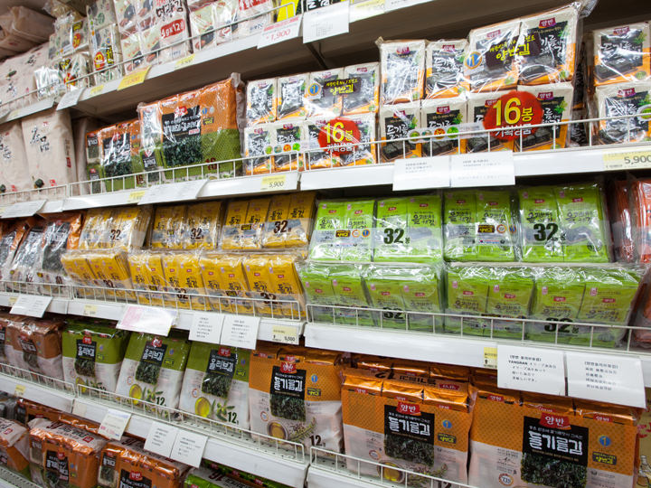 韓国海苔は、日本でも親しまれているごま油風味だけでなく、キムチやプルコギの味付きや、ごま油の代わりにオリーブオイルを使用した商品など、本場韓国では様々なアレンジ商品が!10個程度でまとめ買いすれば、1つ300ウォン前後で調達できます。