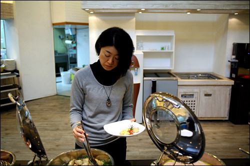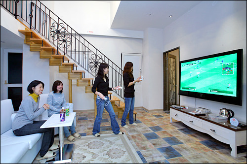 ロイヤルスイートは女性同士ワイワイはしゃぐのにぴったりの部屋です。まずは設置してあるニンテンドーのWiiでゲーム大会。(フロントでWiiのゲームソフトを選び、リモコンを受け取ります。表示言語は韓国語)。部屋が広いので鬼ごっこもできちゃいます。喉が渇いたら冷蔵庫に入っている無料のドリンクを。