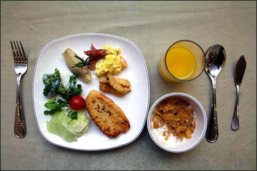 爽やかに目覚めたら、元気に朝食を食べに行きましょう。ベニキアホテルアカシアは朝食バイキング(7:00~9:00、コネスト予約時に要申込、1,100円)があるので、わざわざ外に行く必要なし。地下2階の朝食バイキング会場に、サラダやスクランブルエッグ、おかゆなど20種類以上の洋食を中心としたメニューが並びます。朝から贅沢なひとときです。