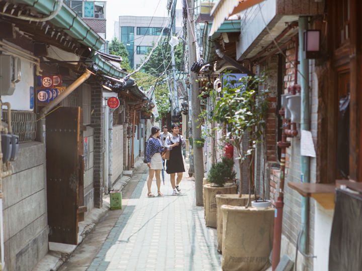 最初の目的地は「益善洞韓屋村(イクソンドンハノンマウル)」。細い路地には、古くなった韓屋(ハノッ)を現代風にリフォームしたお店が並びます。少し街を散策した後、レストラン、カフェへと向かいましょう。