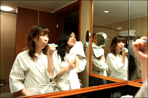 部屋に戻ってからは一番のくつろぎタイム。客室に用意された部屋着(スーペリアルームは浴衣)に着替えたら、夜のソウルを背景にのんびり。部屋からはライトアップされたNソウルタワーが見えるほか、逆方向には東大門の夜景も。ケーブル放送でNHKも見られる大型テレビ、自分で入れられるコーヒーメーカーなど備品も充実しています。体をほぐしてリラックスしていると、いつのまにか夢心地に…。