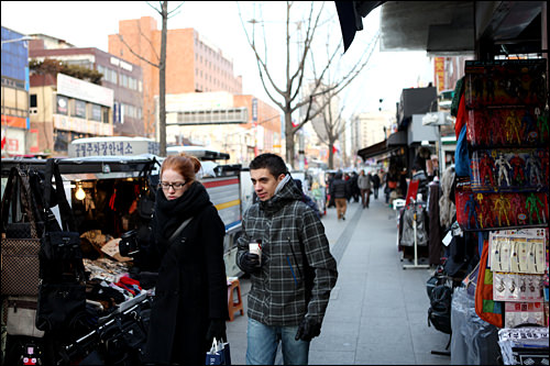 B級グルメの宝庫、東大門。以前より数は減りましたが、道端の屋台も健在です。トッポッキなどのB級グルメと、商人に人気「クギル粉食(※閉店)」のあんまん(チンパン)でショッピングの前の腹ごしらえを万全にした2人。しっかり晩御飯を済ませたいときは「タッカンマリ(鶏鍋)通り」や「新堂洞(シンダンドン)トッポッキタウン」など近くのグルメ通りに行っても。