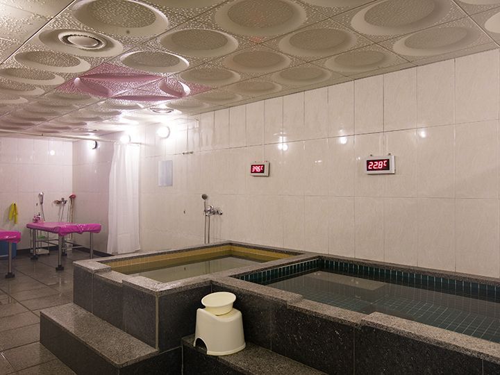 「黄土汗蒸幕(高温)」「塩汗蒸幕(低温)」と温度の違う2種類の汗蒸幕を行ったり来たりできるのが特徴です。お風呂でリラックスしたあとは、あかすり体験。朝シャンプーまでできて、さっぱり。