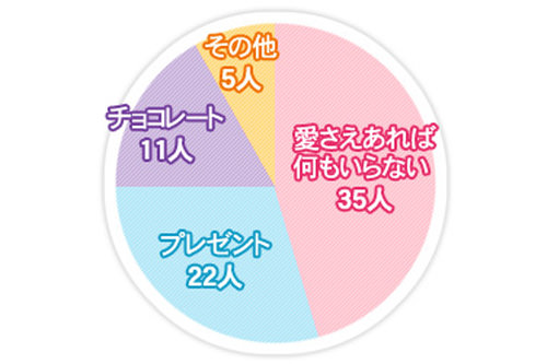 「チョコレート」と倍以上の差をつけて2位に選ばれたのは「プレゼント」。みなさん、食べてなくなってしまうものより、ずっと使えるものがお好みのよう。