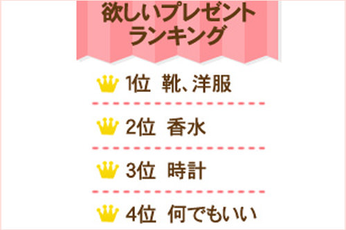 プレゼントの中でも、特に「靴」と「洋服」が票を集めました。「恋人に靴をあげたらその靴を履いて他の人のところへ行ってしまう(浮気する)」という迷信が信じられていた時代は完全に終わったようですね。人によって好みが分かれるファッションアイテムをお望みとは、彼女の方もセンスが問われている?